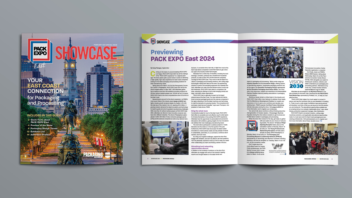 PW's PACK EXPO East Showcase offers excellent exposure for your company before, during and after PMMI's east coast event. Packed with essential show information and distributed with Packaging World's February issue, the SHOWCASE will include an exhibitor list, conference information and company profiles.